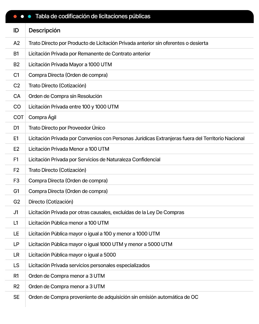 Para poder identificar el tipo de licitación que corresponde la oportunidad de venta a la que nos estamos enfrentando, solo basta con identificar el ID que tiene cada código. Cada ID ordena, tanto por tamaño como por modalidad, las diferentes clases que existen dentro de Mercado Público. Existe una tabla enorme con cada una de estas etiquetas. Acá te compartimos algunos códigos actualizados:
